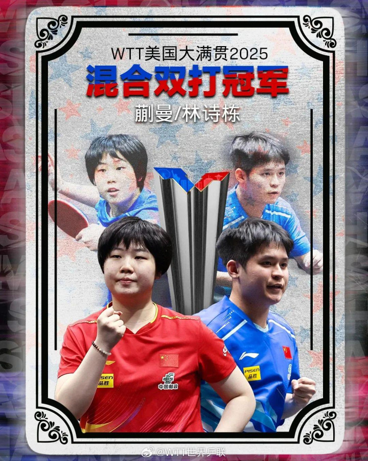 ◆在11日进行的世界乒乓球职业大联盟(WTT)美国大满贯赛比赛中,国乒组合林诗栋/蒯曼获得混双冠军;孙颖莎/王曼昱和王艺迪/蒯曼会师女双决赛,提前包揽冠亚军。