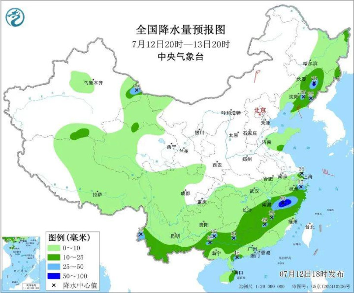 12日20时至13日20时,新疆东部、吉林中部、辽宁东部、江南中东部和南部、云南西部和南部、华南北部和西部等地部分地区有中到大雨。温馨提示:请新疆、华北、黄淮、江汉等地的公众关注未来气温走势,及时准备好防暑降温物品,高温来临时不要在户外长时间活动。